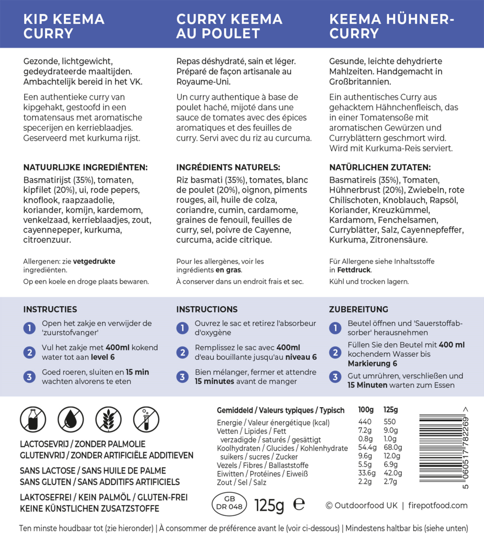 De Firepot Serving Chicken Keema Curry is een geschikte maaltijd voor op koude nachten. Deze curry is niet te vettig of te pittig. De maaltijd heeft een gewicht van 125 gram en bevat 550 kcal. Deze maaltijd is gluten-, lactose-, palmolie- en kunstmatig toegevoegde stoffen vrij. De ingrediënten van deze maaltijd zijn: Basmatirijst (35%), tomaten, kipfilet (20%), ui, rode peper, knoflook, koolzaadolie, koriander, komijn, kardemom, venkelzaad, kerriebladeren, zout, cayennepeper, kurkuma en citroenzuur. De maaltijd bevat geen allergenen.