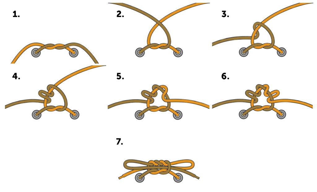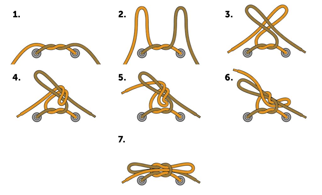 Bij deze knoop begint u met de standaard start van een knoop. Sla links over rechts en haal de linkerveter daarna onder rechts door (stap 1). Nu maakt u van beide veters een lus (stap 2) en deze legt u over elkaar heen, waarbij de rechterveter aan de voorzijde zit (stap 3). De linkerlus haalt u nu door het gat (stap 5 en 6). Nu trekt u de knoop met beide lussen aan (stap 7).