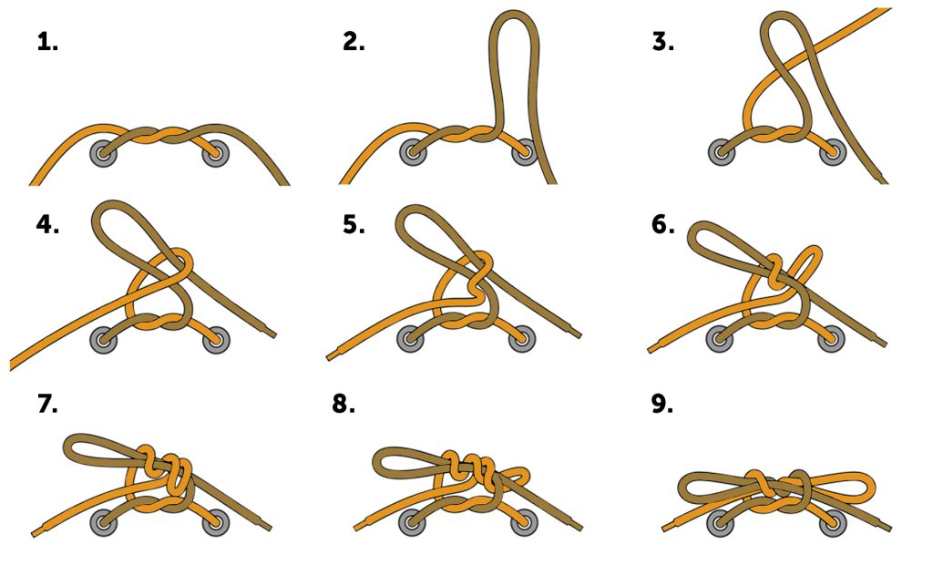 Deze knoop lijkt op de gewone strik en zo begint hij ook. U begint met de standaard start van een knoop, waarbij u links over rechts slaat en de linkerveter daarna onder rechts doorhaalt (stap 1). Maak van de rechterveter een lus en haal hier de linkerveter omheen (stap 2 en 3). Deze linkerveter haalt u door het gat (stap 4 en 5). Tot hier zijn de stappen hetzelfde als de gewone strik. In plaats van het aantrekken van de strik, haalt u nu de lus van de linkerveter nog eens om de rechterveter heen en door het gat (stap 7 en 8). Nu trekt u de strik via de lussen aan (stap 9).