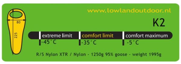 De Lowland K2 Expedition slaapzak is niet te missen tijdens extreme temperaturen. Deze slaapzak biedt een uitermate goede bescherming tegen heftige kou tot wel -35°C. De slaapzak bestaat uit een ganzendons van wel 1 kilo en donsbanen van 8 centimeter dik. De slaapzak bevat het materiaal Diamond R/S Nylon. Dit materiaal zorgt ervoor dat de slaapzak waterafstotend, winddicht, ademend en vochtregulerend is. Voor nog meer bescherming tegen de kou heeft de slaapzak een dubbele tochtstrook, aantrekkoord, tochtslurf en een voorgevormde capuchon. Door de rits, die 2-richtings is, aan de onderzijde te openen kan de slaapzak ook worden geventileerd. Door de tuchtslurf en de ventilerende ritssluiting kan de slaapzak in alle seizoenen gebruikt worden. Om de K2 Expedition slaapzak makkelijk mee te nemen wordt er een compressiehoes bijgeleverd.