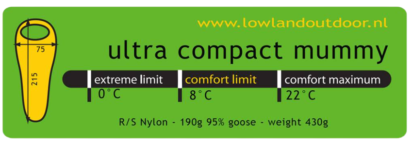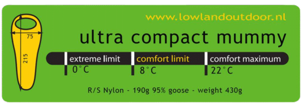 De Lowland Ultra Compact Mummy 430 gram slaapzak is geschikt voor mensen met een lengte tot 180 centimeter.